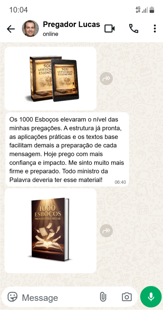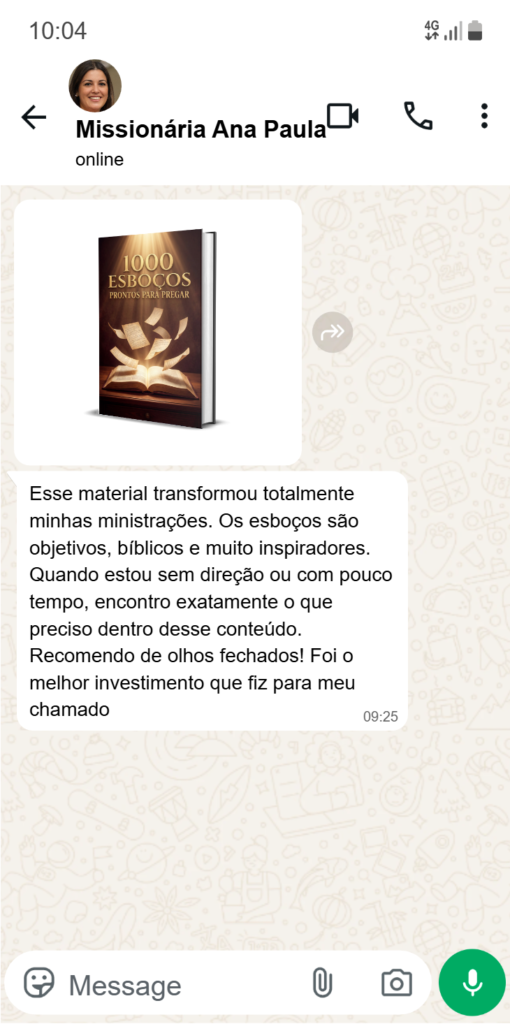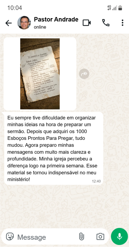 Os resultados falam por si. Pastores, pregadores, líderes e estudantes de teologia em todo o país têm experimentado uma verdadeira revolução em seus sermões após utilizar o 1000 Esboços Prontos Para Pregar. Aqui você verá relatos reais de pessoas que descobriram mais clareza, inspiração, profundidade e direção ao preparar suas mensagens. Cada testemunho revela como este material se tornou uma ferramenta indispensável no ministério — ajudando a pregar com mais autoridade, confiança e impacto espiritual.